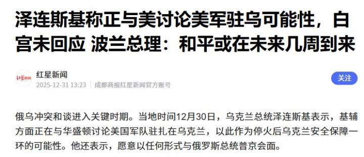 更大胆的是,泽连斯基在12月30日的记者会上松口称,正与美方探讨美军进驻乌克兰的可能性。这就不是“寻求和平”了,而是试图引狼入室。
