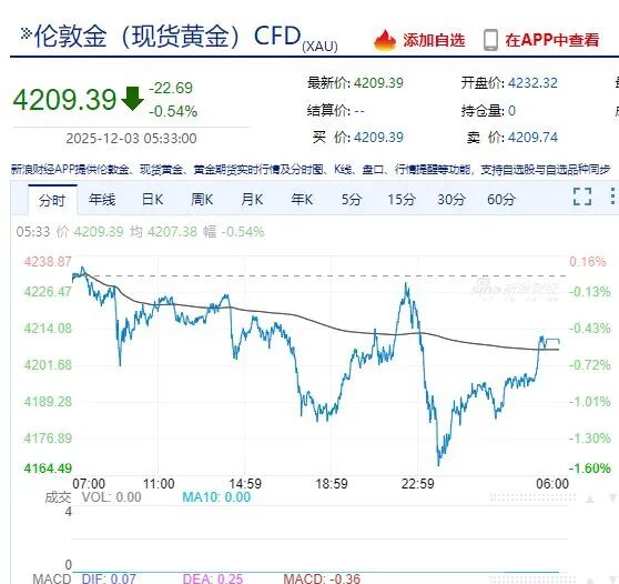 现货黄金收跌0.54%,报4209.39美元/盎司。纽约黄金跌0.70%。