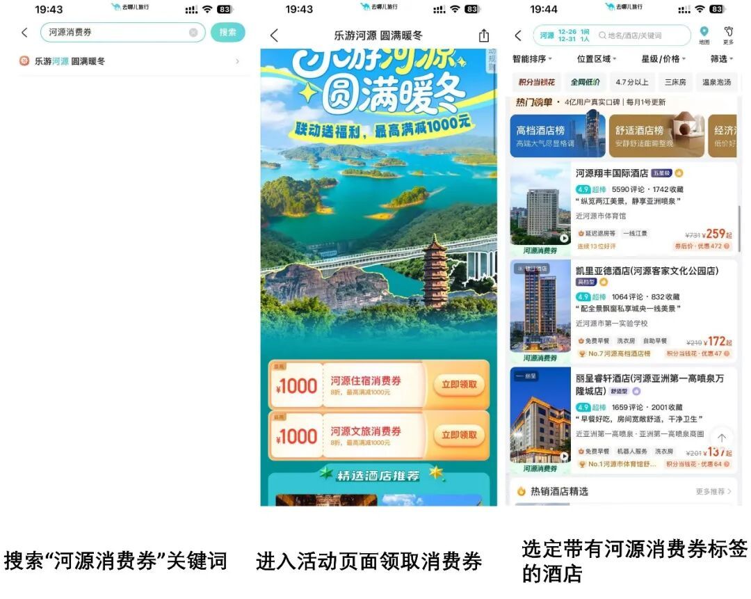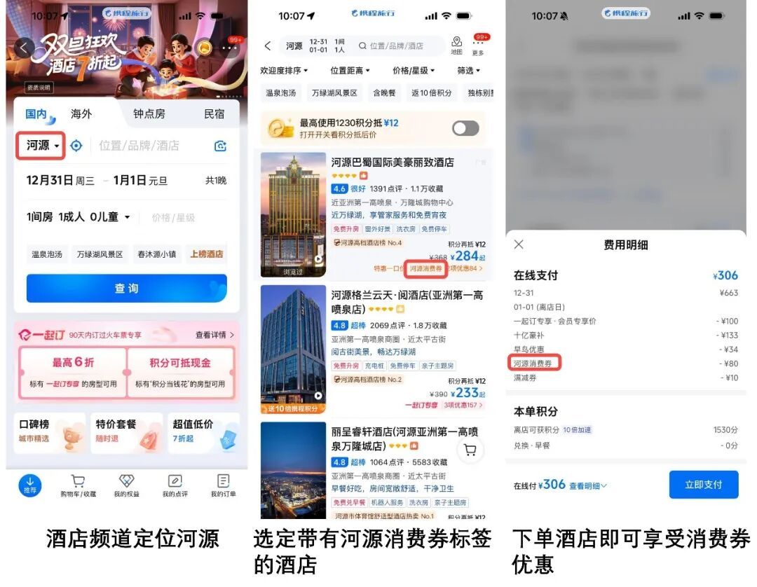 1. 酒店住宿消费券:打开携程APP,首页点击进入“酒店”频道,手动定位“河源”;点击查询进入产品列表页,选择带有“河源消费券”标签的酒店;进入酒店详情页后,点击“领券订”,一键下单即可自动享受优惠。