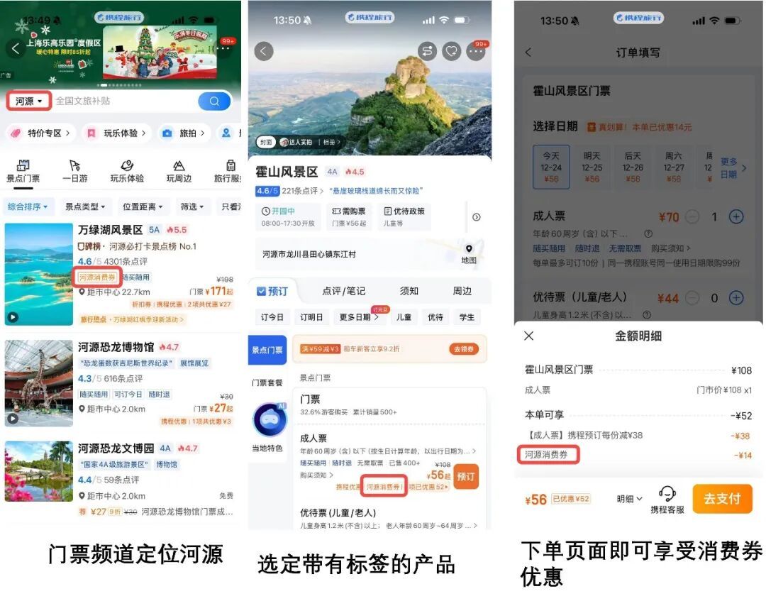 2. 景区门票消费券:进入携程APP“门票/玩乐”频道,定位“河源”;搜索目标景区门票产品,在订购下单的支付详情页面,若显示“河源消费券”标签,即可直接享受优惠折扣。
