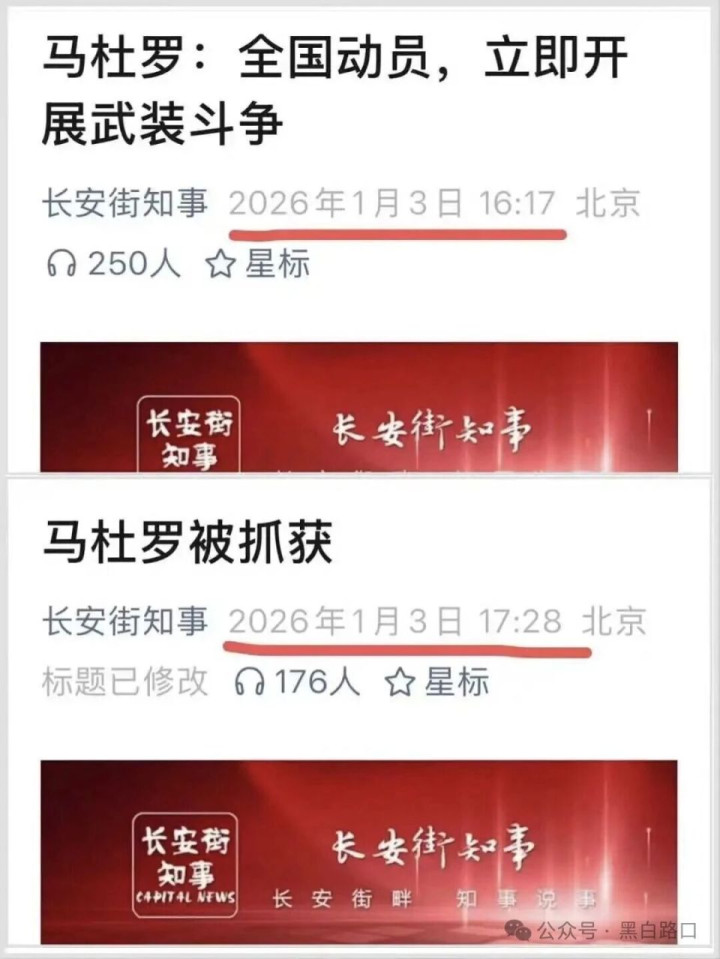 也许真的是1小时22分钟的突袭,美军坐着直升机空降委内瑞拉首都加拉加斯,把马杜罗抓走了,再差劲的委内瑞拉军队也不至于一枪不放。